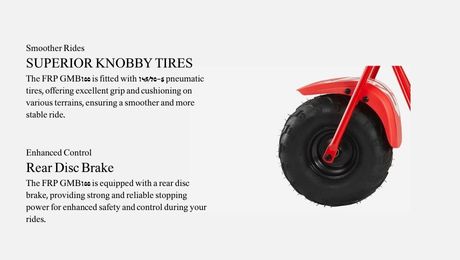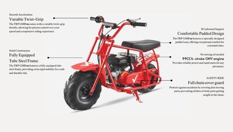 EFFICIENT CHAIN TENSION: FRP GMB100 gas mini bikes feature a reliable tensioning system designed for chains. It ensures that the mini bike's chain maintains optimal tension during the entire ride, preventing slipping, skipping, or derailment.