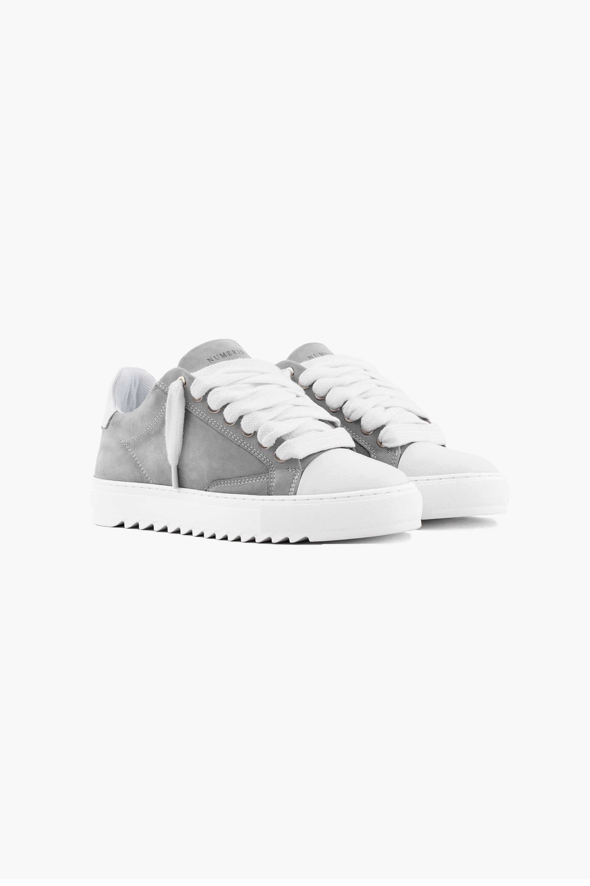 The Atelier trainer was inspired by Parisian lifestyle. Every stitch and detail was meticulously designed in a Parisian workshop. The Atelier features a premium platinum grey nubuck upper with crisp white stitching and finished with our signature pebbled leather white toe cap. The interior of the trainer features collar lining providing unrivalled comfort. The final touches see our Numeriś branding on the heel of the shoe.