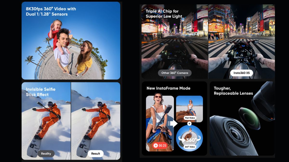 - InstaFrame Mode: Simultaneously records a standard flat video and a full 360-degree video, facilitating immediate sharing and comprehensive post-production editing .